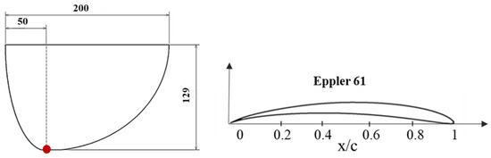 The geometry of this MAV consists of a Zimmerman wing platform with Eppler 61 airfoils. The Zimmerman wing is composed of two half ellipses joined at the reference point (red point) of Figure 2. For one half ellipse, this reference point corresponds to ¼ of the wing root chord and for the second one to ¾. The fuselage is designed with Whitcomb airfoils. These features were selected according to the main aerodynamic parameters: maximum lift to drag ratio, , maximum lift coefficient, , and minimum drag coefficient, . Figure 2 shows the configuration of the wing where x/c is the non-dimensional chord.