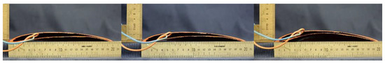 Especially, they selected Micro-Fiber Composite (MFC) piezoelectric actuators since these present the ability of using them in elongation and contraction depending on the applied voltage and are low-cost devices with a low voltage operation. Moreover, these devices present other advantages such as durability, flexibility, directional actuation, increased damage tolerance and higher efficiency than other design strategies as mechanical devices. These actuators were installed on the lower surface of the wings and the voltage range was between 0 V and 5 V (see Figure 3). Figure 3 shows the Eppler 61 airfoils in different stages. Therefore, the airfoil on the left side corresponds to the Eppler 61, that is, with no voltage. However, the airfoil at the center presents a voltage of 2.8 V and on the right side, the airfoil corresponds to the maximum voltage, 5 V.
