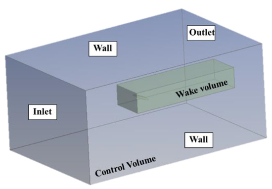 Secondly, the control volume is defined according to the dimensions of the simplified model. The boundary conditions of the control volume are delimited depending on the position of the model inside of it (it can be observed in Figure 5). Therefore, the face in front of the leading edge of the wing corresponds to the inlet and the one behind the trailing edge of the wing is the outlet. The rest of the boundaries are walls. The boundary conditions are defined as the velocity inlet and pressure outlet (see Figure 6). In this fluid control volume, as one of the goals is to study the airflow wake, it was more convenient to divide the region into two to obtain a higher resolution in the interest region; consequently, one volume encompassing only the wake (wake volume, see Figure 5) to generate a smoother mesh, therefore, the flow equations will be solved in a higher number of cells and the final resolution of simulations could be better. The second volume (control volume, see Figure 5) contains a mesh with larger cell dimensions to reduce calculation time. Figure 6 shows the control volume and wake volume meshed and Table 2 shows the features of the mesh used for this analysis.