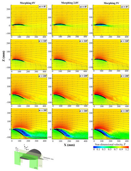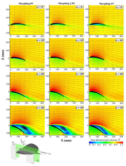 Non-dimensional velocity maps at 1/3 for all wing configurations: morphing 0 V, 2.8 V and 5 V (, ).