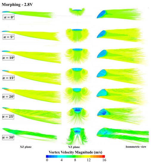 To complete the flow visualization, Figure 10 shows several perspectives of the wake structure for the MAV with semi-deformation in curvature and thickness (morphing 2.8 V). The air wake is presented in three views (XZ plane, YZ plane and isometric perspective). The vortex velocity magnitude (defined as ) presents the highest values near the wing tips and only for the angles of attack from 15° to 25°. It can be seen how the flow was attached until α = 25°. From that angle of attack on the vortex, the velocity magnitude of the wake begins decreasing and the streamlines over the wing surface start removing from it (see the blue surface in isometric view).
