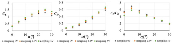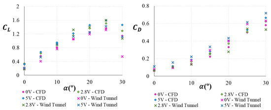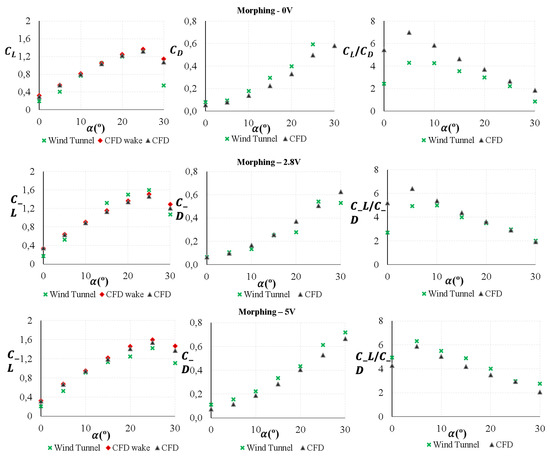 Figure 15 shows the lift coefficient (left), total aerodynamic drag coefficient (center) and lift/drag ratio (right) according to the angle of attack for the three configurations (with no wing deformation, 0 V, semi-deformation, 2.8 V and maximum deformation, 5 V) for case U∞ = 10 m/s and β = 0°. In the results related to lift coefficient, the experimental data were obtained by Particle Image Velocimetry in the wind tunnel. However, the total aerodynamic drag coefficient was measured by the balance. The CFD wake data were defined as the wake survey analysis where the lift coefficient can be obtained by using the Maskell theory (Section 2). Finally, the direct numerical data obtained from the numerical simulation with Ansys Fluent are presented by CFD.