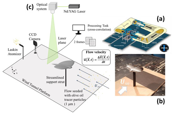 Low-Speed Wind Tunnel (a), scaled model inside the wind tunnel test section (b) and Particle Image Velocimetry set-up (c).