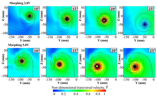 Figure 13 shows the non-dimensional transversal velocity obtained by measuring in the wake using Particle Image Velocimetry. The most relevant angles of attack are presented and only for the wing configuration of 2.8 V and 5 V. From these data, the aerodynamic performances were calculated.