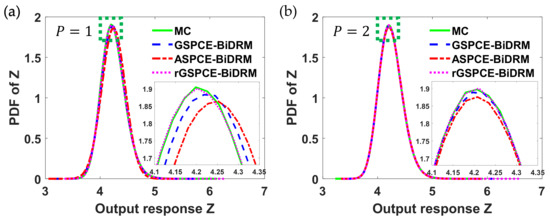 The number of evaluations in Table 9 was determined by counting the total number of quadrature points to approximate each integral. For example, the number of evaluations to calculate each PCE coefficient is 561 for the GSPCE- and ASPCE-BiDRM, since there are 7 one- and 21 two-dimensional integrals resulting from the BiDRM, i.e., . In contrast, the number of evaluations to calculate a PCE coefficient is 406 for the rGSPCE-BiDRM since there are 6 one- and 15 two-dimensional integrals, i.e., . In addition, for the NIDP-based approaches, the number of evaluations to approximate each coefficient is calculated as in both the GSPCE- and ASPCE-NIDP and in the rGSPCE-NIDP. As compared to Example 2, a larger number of evaluations was used here for the NIDP-based approaches, since there are more uncertainties.