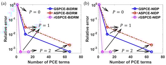 The results of NIDP-based UQ are shown in Figure 3b. Details about the implementation of the NIDP approach in each case study to solve the PCE coefficients for can be found in [24]. As compared to the results in Figure 3a, it was found the relative error of the BiDRM-based approach is identical to the NIDP-based method in Figure 3b. For example, when was set to 2, the relative error of the rGSPCE-BiDRM is ~0.000607, which is identical to the rGSPCE-NIDP. As compared to the non-intrusive methods, this validates the UQ accuracy of the algorithm in this work, which uses the gDRM to approximate high-dimensional integrals in the spectral projection.