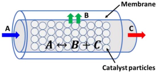 An inert membrane reactor with catalyst on the feed side (IMRCF) is shown in Figure 4, where the following reaction occurs [41,42]: