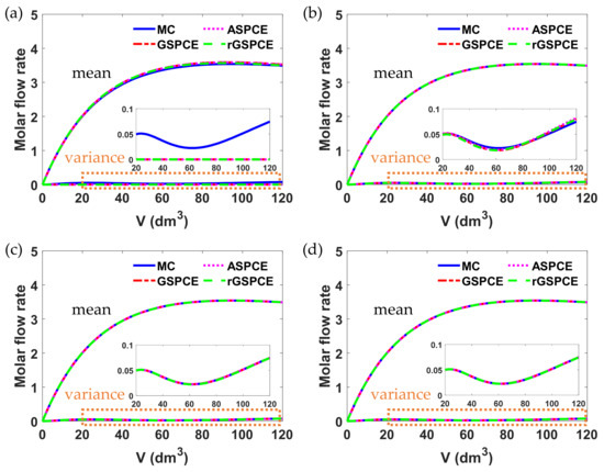 As can be seen in Table 4, the computational time increases as increases. It was also found that the rGSPCE-BiDRM-based method that has four-dimensional random space requires less computational time, as compared to the other two case studies. For example, when was set to 2, the time for the rGSPCE to calculate all PCE coefficients was ~0.9688 s, which is significantly lower than the ASPCE- and GSPCE-BiDRM methods. Besides, it was found that the computational time of the ASPCE-NIDP is large for each polynomial order , compared to the BiDRM-based methods, and is increased significantly as increases. This shows the advantage of our algorithm at combining the GS and BiDRM with PCE. To further validate our algorithm, two examples in chemical engineering will be followed.