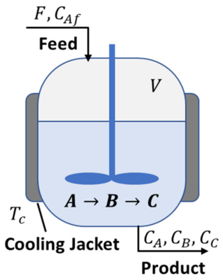 Illustration of a continuously stirred tank reactor (CSTR) with a series reaction [43].