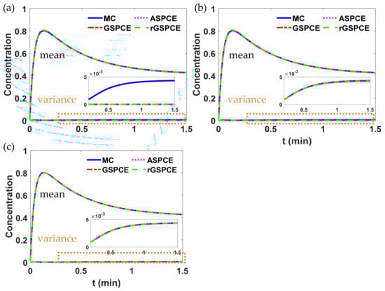 As in Table 8, three parameters, , , and , are assumed to follow a Weibull distribution. The rest of the parameters are described by standard distributions (e.g., uniform or normal). Since there are 7 parametric uncertainties, a seven-dimensional random space () is considered. In this example, a 1% variation around each mean value of the uncertain parameters and was introduced, and the rest of the parameters are assumed to have a 10% variation around each mean value. As in Examples 1 and 2, three case studies were conducted by combining the GSPCE, ASPCE, and rGSPCE with the BiDRM, respectively. For the GSPCE-based case study, PCE expressions of , , and were constructed using the modified GS, whereas the PCE expressions of , , and were approximated with the orthogonal polynomial basis functions in the Askey scheme for the ASPCE-based case study. For the rGSPCE-based case study, two uncertainties and (i.e., ) were treated as one uncertainty (i.e., the similarity parameter described in Section 2.3), which results in a six-dimensional random space (). As done in Examples 1 and 2, MC was implemented for comparison purposes, where 106 samples for each parametric uncertainty were used. Uncertainty in concentration was studied for each case study with respect to different polynomial orders of each uncertainty (i.e., was set to 0, 1, and ), and the simulation results are shown in Figure 8.