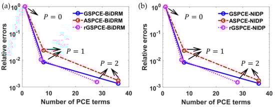 As can be seen in Figure 6a,b, the average relative errors decrease as the polynomial order increases in all case studies. It was also found that the convergence rate of the GSPCE-based algorithm is slightly faster than the ASPCE-based method. Notably, the rGSPCE-based method outperforms other case studies when was set to 3. In addition, it was found that the relative errors of the GSPCE- and ASPCE-BiDRM case studies in Figure 6a are slightly larger, compared to the GSPCE- and AGSPCE-NIDP in Figure 6b. This is because the BiDRM-based approach requires a smaller number of evaluations (), as compared to the NIDP-based approach (see Table 6). However, when was 3, we found that the relative error of the rGSPCE-BiDRM is lower than the rGSPCE-NIDP. This shows the advantage of combining the GS and gDRM with PCE, which reduces both the dimensionality of random space and the number of evaluations.