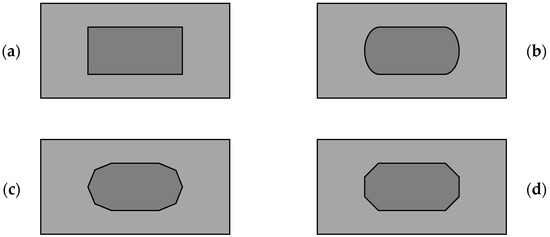 Possible shape forms that the repair patch can have: (a) rectangular, (b) ellipsoid, (c) octagonal horizontal, (d) octagonal vertical.