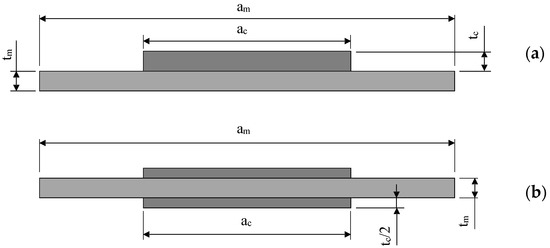 In case the composite repair technique is possible, the patch’s material, configuration (one or double-sided), and shape shall be decided. If there is no preference, then the optimal options can be determined through one-factor-at-a-time (OFAT) analyses. Through these analyses, a design parameter is examined, while all other factors remain fixed. This analysis methodology is followed due to the discrete nature of these parameters—e.g., the patch’s material and configuration is a binary decision—while the shape has four choices as shown later in the study. After setting these parameters, the patch’s main dimensions must be assigned (design parameters). In order to minimize the problem’s complexity, the patch is assumed to have an aspect ratio αc equal to that of the metal substrate αm. Thus, the composite’s length ac and width bc are a product of the plate’s respective values (am and bm) and its aspect ratio, i.e., ac/bc = αc = αm = am/bm. Hence, let these two parameters be replaced by a percentage coverage of the substrate (denoted by c). As a result the following expressions are obtained: c = ac/am = bc/bm.