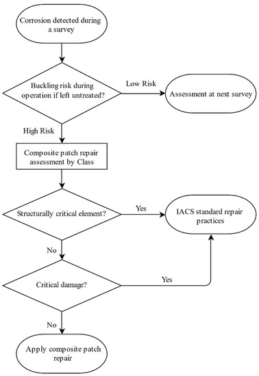 Assume that corrosion is detected during a plate’s inspection and the thickness measurements indicate that the magnitude of material lost sets the structural member at buckling risk if left untreated. Based on recommended practices currently applied in the shipbuilding industry (DNV [6]), if the member is structurally critical, traditional repair methods are used. Additionally, the same repair methods are applied if the defect’s scale is large, and a composite patch would not provide adequate strength. However, if these previous statements do not apply, a composite patch repair could be installed. The decision-making points from the defect detection to the repair method’s application are illustrated in the flowchart in Figure 5.