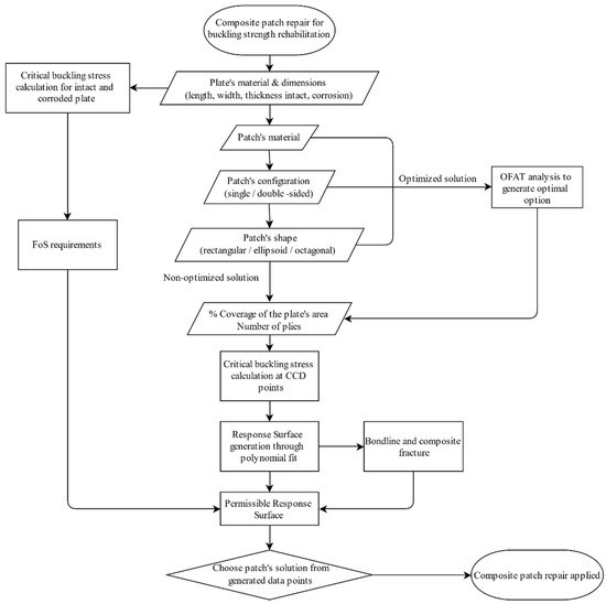 For specified values of FoS, respective to the initial buckling strength, the generated surface indicates the allowable combinations of the patch’s design parameters. In order to further validate the method, a fracture check on the patch and the bondline is also conducted. This might result in a possible restriction of the permissible solutions provided by the response surface. This design methodology is visualized in the flowchart shown in Figure 6.
