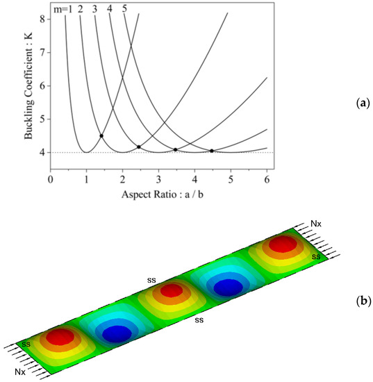 In the above equations, Nx,cr is the critical buckling force per unit width, while Em and νm are the plate’s Young’s modulus of elasticity and Poisson’s ratio, respectively (Table 1). Additionally, Kcr is defined as the critical buckling coefficient and is dependent on the plate’s primary dimensions (length, width) and the values n and m, which are the number of half-waves developed across the plate’s longitudinal and transverse directions. A plate’s deflection (eigenforms) is most probable to appear with one half-wave across its transverse since the obtained stress (eigenvalue) is lower, indicating a lower stable energy state. Thus, the value of n = 1 can be assumed when calculating critical buckling stresses using Equation (1). It should be noted that by studying Equation (2), as the aspect ratio increases—i.e., long plates—the critical buckling coefficient Kcr tends to the value of 4. This effect is visualized in Figure 7a, indicating that a stable energy state is achieved when a long plate buckles forming several half-waves across its length. The number of these half-waves is an integral product of its width (Figure 7b).