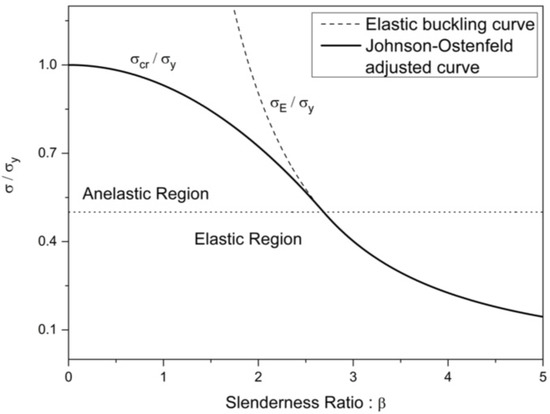 Both Equations (1) and (3) do not limit the obtained stress values, meaning that they could surpass the material’s yield point. For this reason, the following corrections according to the Johnson–Ostenfeld parabola (Hughes [14]) must be applied to the elastic stresses to calculate their critical values