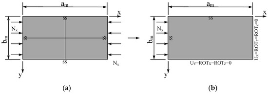Two-dimensional sketch of the geometry’s (a) full and (b) quarter model and its boundary conditions for the case of compressive buckling.