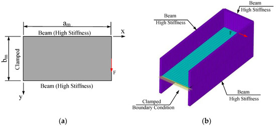However, the same modeling cannot be applied to the shear buckling problem, since it utilizes a different approach to the problem with respect to the boundary and loading conditions that do not allow for symmetry to be used, hence the geometry is modeled in its entirety (Figure 11). The boundary condition in effect is the restriction of all degrees of freedom at one of the short edges, i.e., clamping conditions. In the rest of the edges, large beams are modeled with substantial stiffness that allows the geometry to be considered a cantilever, thus having low bending effects (Anyfantis [2]). This way, the shear buckling effect is acquired with a good approximation. The load is applied to a pilot node at the free short edge’s center, with a direction parallel to it. Thus, the critical buckling force Nxy,cr is acquired by dividing it by the plate’s thickness (same principle as Equation (1)).