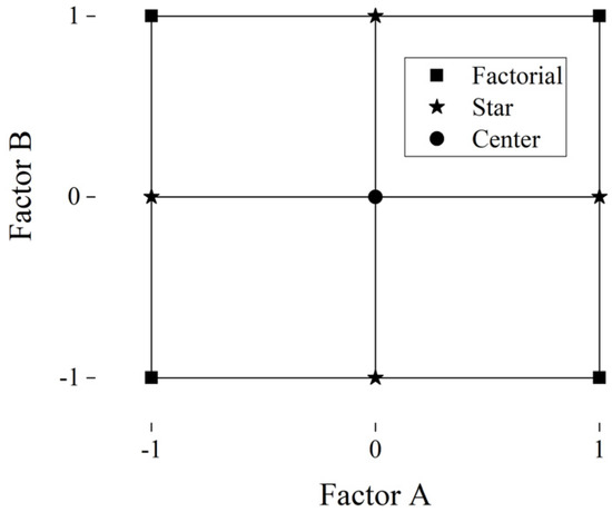 DoE is the design of an experiment based on input parameters and using statistical tools to approximate the output as best as possible. One basic example of a DoE method is an OFAT analysis, in which the output of an experiment is based on one factor at a time (as indicated by the title itself) without implementing possible interactions between input parameters. Another method used for this study’s purposes is an RSM, which is a two-level design. Specifically, two input design parameters are used to define the design space. A central composite design (CCD) then indicates the data points needed for the method to be performed. According to a face-centered CCD (CCF), three point types are used: factorial (shows two-factor interactions), center (shows curvature), and star (shows quadratic effects). At the points of the design space indicated by the CCD (Figure 12), the output is obtained from an experiment. Once these points are specified (known x1, x2, and y), a polynomial surface is best fit to them with the help of statistical tools for its lack-of-fit evaluation.