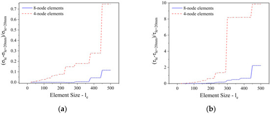 The patch’s properties under consideration are its material, its configuration, and its shape (as shown in the flowchart in Figure 6). In order to obtain the optimal combination, OFAT analyses are conducted. The parameters that are listed in Table 3 are examined against an increasing value of the number of plies and evaluated using the obtained FoS. However, before initiating any analysis, the element properties for the numerical calculations shall be defined. Specifically, mesh convergence tests for four- and eight-node elements were conducted for the compression and shear model containing only the intact metal plate. The results are illustrated in Figure 13 where the element size is plotted with respect to the percentage deviation of the obtained buckling stress from the one obtained by the minimum allowed size of 20 mm. The graphs indicate that the eight-node elements, combined with a mesh size of 100 mm, provide sufficient accuracy, with less than 0.2% deviation from the converged value.
