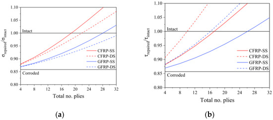 As aforementioned, if a plate is corroded, then its effective thickness is reduced. By subtracting material from it, its load-bearing capabilities are lessened due to a weaker cross-section. The structural member’s cross-section can be stiffened by adding a fiber-reinforced composite patch, which rehabilitates for the material wastage. However, there are a plethora of configurations for the patch that can be applied due to multiple design parameters. The important ones are the fiber’s material, the matrix’s material, the laminate’s stacking sequence, the number of plies used, the patch’s basic dimensions, the repair’s configuration (one or two-sided), and the shape. Finally, several other factors affect the final product: humidity, temperature, curing conditions, the adhesive used, and the application method (hand lay-up, pre-preg, or vacuum infusion), the effect of which is out-of-scope.