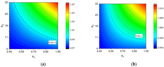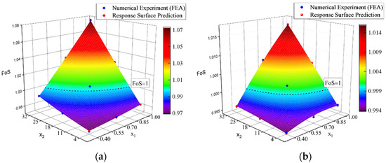 These response surfaces are illustrated in Figure 16a,b, where both the experimental points obtained by the numerical calculations and the predicted points are plotted. Additionally, the FoS requirement is also visible on the surface as a curve. Any design parameters combination with a generated FoS below the indicated requirement curve is not acceptable. In Figure 17a,b, the same surfaces are plotted as a 2D contour for better visualizing the acceptable combinations.