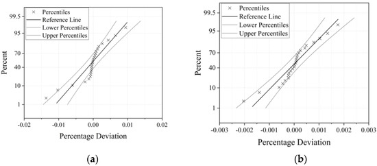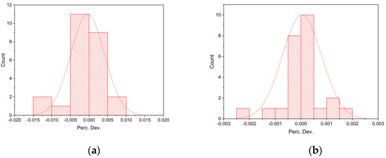 The fitted surfaces are evaluated using statistical tools, such as a histogram and a normal probability plot, using the percentage deviation between calculated and predicted values as indicators. The data points used were the CCD design points with the addition of mid-points to further assess the surface’s lack of fit (evaluation points). A list of all points used for the method’s validation is shown in Table 5. The calculated R-squared value for both surfaces is greater than 0.99, which exhibits a 99% fit. The percentage deviations were plotted in histograms (Figure 18a,b) and normal probability plots (Figure 19a,b), concluding that the prediction model follows a normal distribution and lacks significant statistical noise.