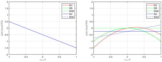 Variations in the characterisation of the aeroelastic stability of the typical section are then mostly driven by the pitch rate, the contribution of which differs among almost all aerodynamic models. In particular, the lift derivative of the DU model decreases with the elastic axis moving backwards but does remain always destabilising, whereas the moment derivative shows a parabolic dependence on the position of the elastic axis and is destabilising when the latter lies between the aerofoil’s mid-chord and control point (i.e., between the second and third quarter chord). Thus, this aerodynamic approximation gave controversial flutter results [4], since some cancellations between the circulatory and non-circulatory contributions to the unsteady airload do not hold in the absence of wake vorticity [15] and such inconsistencies can lead to very unrealistic results. The lift derivative of the QS model also decreases with the elastic axis moving backwards, but it becomes stabilising only when the latter lies beyond the aerofoil’s control point, whereas the moment derivative shows a parabolic dependence on the position of the elastic axis and is always stabilising but at the aerofoil’s mid-chord; however, this aerodynamic approximation also gave controversial flutter results [2]. The derivatives of the SQS model are always zero and thus do not contribute to the stability, which can lead to unrealistic results; the lift derivative of the SU model is also always zero, but the moment derivative is constant and always stabilising. Finally, the lift derivative of the SQU model is constant and always destabilising, whereas the moment derivative increases with the elastic axis moving backwards and becomes destabilized when the latter lies beyond the aerofoil’s control point (where SQU and DU models, as well as SU and QS models, are equivalent). The SQU aerodynamic approximation shall then not be used in such a case, which is, however, unlikely for practical application (due to both the geometrical features of real wings and static divergence issues in the first place).
