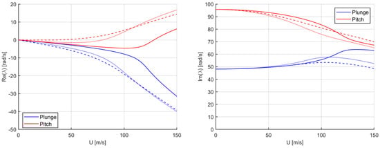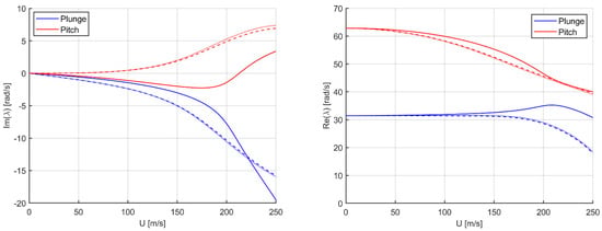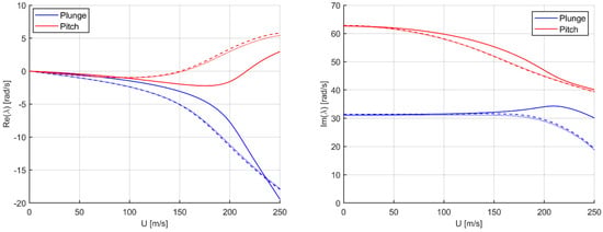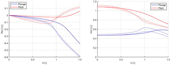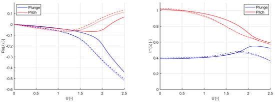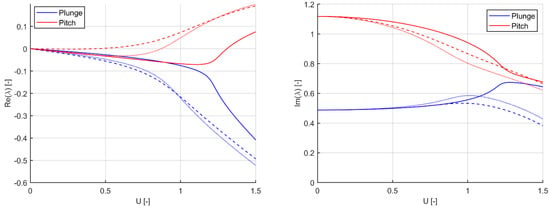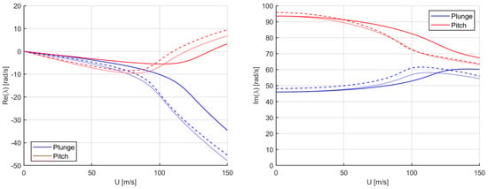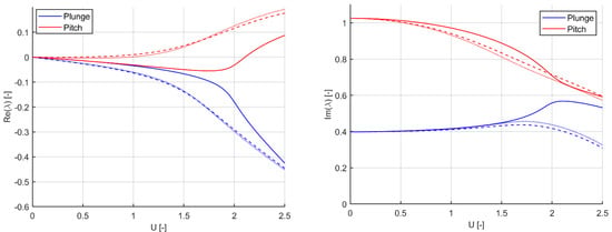 Flutter results for Case A [6] are given in Table 3; the related flutter diagrams for the evolution of the nondimensional complex eigenvalues are shown in Figure 3 and Figure 4, for selected aerodynamic models. In particular, the results from DU and SS models are not plotted since they are less relevant, as anticipated in the dedicated sections: those from the former model are questionable from a physical standpoint, while those from the latter model are already available in the references and provide no realistic evolution of modal damping.