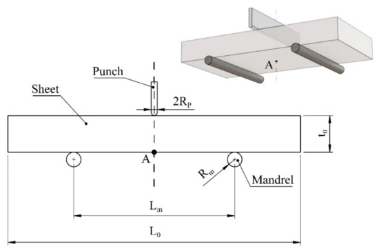 Simulation of a three-dimensional (3D) bending test, using ABAQUS software, is performed in this study. A schematic presentation of a metal sheet with length Lo and thickness t is shown in Figure 2. Rigid bodies are considered for both punch and mandrel with radii and , respectively. The mandrel is stationary with a length span of when the punch applies a force in the middle section of the sheet. The sheet rests on the two mandrel and punch motion deforms the sheet.