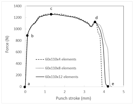 The deformation steps for a sheet with 10 mm width are shown in Figure 5 step-by-step up to complete fracture. The steps are marked on the force-displacement curve in Figure 4. Force increases linearly up to step “b” when the sheet is in the elastic region. Then, it reaches the maximum value with advancement of punch in step “c”. Fracture initiates in step “d” with further punch advancement, and eventually complete failure in step “e” happens when the load drops and it reaches zero value.