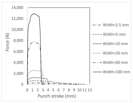 Force-displacement curves in metal sheets with various widths.