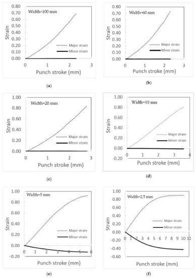 Major and minor strain in metal sheets with various width/thickness ratios; (a) width = 100 mm, (b) width = 60 mm, (c) width = 20 mm, (d) width = 10 mm, (e) width = 5 mm, and (f) width = 2.5 mm.