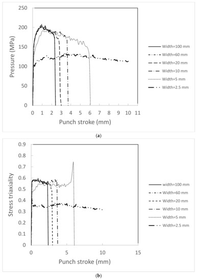 Figure 9 presents the hydrostatic pressure and stress triaxiality at point A (see Figure 2), where fracture initiates as a function of punch stroke under various widths. It is found that stress triaxiality and hydrostatic pressure decrease with increased pressure, helping to delay void growth (Equation (6)). Stress triaxiality and the hydrostatic pressure do not vary uniformly, which is a result of too few elements in the Z direction. It must be emphasized that the computational time and effort increase significantly with increasing the element in the Z direction.