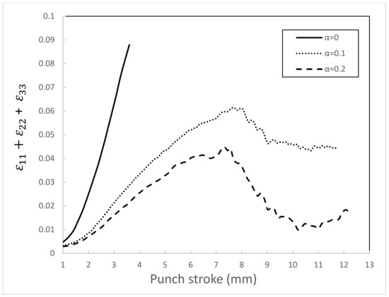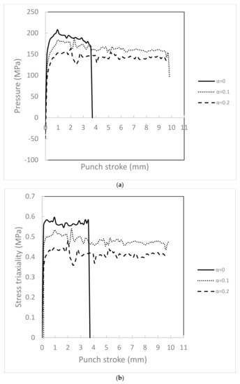 Figure 13 presents the hydrostatic pressure and stress triaxiality at point A (see Figure 2), where fracture initiates as a function of punch stroke under various pressures. It is found that stress-triaxiality and hydrostatic pressure decrease with increasing the pressure and this helps delay void growth following Equation (6).
