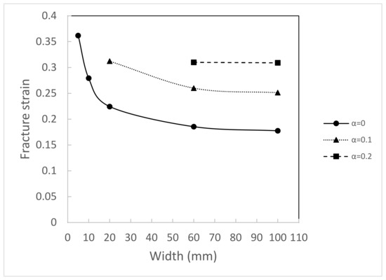 The ductility of the sheet is measured in terms of the fracture strain , where and are the initial and final thickness of sheet in the middle section of specimen, respectively. Figure 11 shows the fracture strain of specimen with various widths and it is observed that the fracture strain decreases with an increase of width. The decrease in fracture strain can be explained by considering the variation in void volume fraction of specimens with various widths. Void volume fraction decreases with decreasing width and this causes an increase in ductility. It is to be noted that fracture does not occur for the sheet with a width of 2.5 mm.