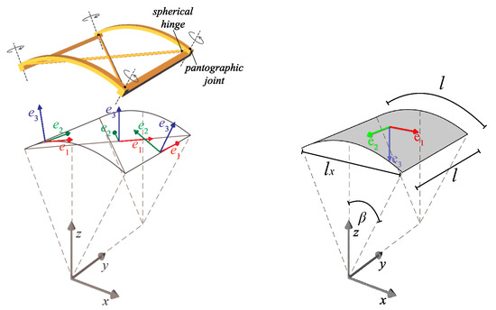 The model is immersed in a three-dimensional space, described by a global coordinate system . In addition, each member is endowed with the own local coordinate system ; in particular, is tangent to the centroid axis of the member and and are the principal axes of inertia of the cross-section. Global and local coordinate systems of any member of the gridshell module are shown in Figure 1.
