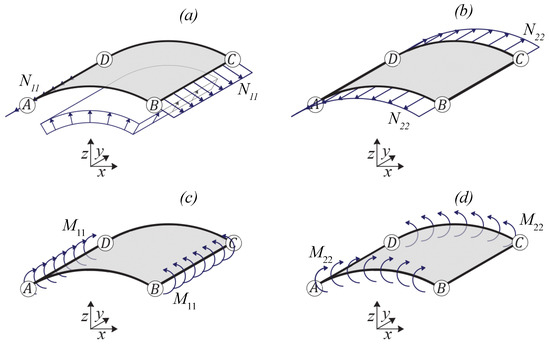 Internal actions in the continuum region corresponding to the REV for the four uniform states: (a) membrane axial action along (b) membrane axial action along (c) bending action about (d) bending action about .