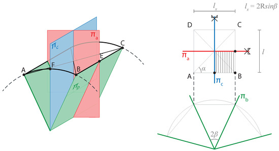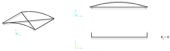 In the second case (b) instead, the strain measures , and characterize the coarse model behavior, and their numerical values are calculated: m, , . Applying Equation (7) again in order to calculate the component of the rotation vector, this is evaluated as 0.102 rad. However, the obtained value of corresponds to the rotation of the arches’ end sections of one module.