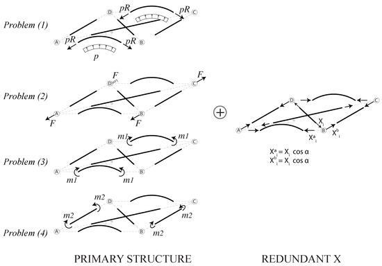 Figure 5. Scheme of the Force Method used to solve the four fine problems. (Left) The four different primary structures, one for each problem. (Right) The auxiliary structure, characterized by the redundant reaction X. - The redundant reaction is projected onto the vertical plane containing the arch and in the plane containing the beam, by obtaining the components and , respectively, where is the angle formed between the diagonal and the plane in the reference configuration.