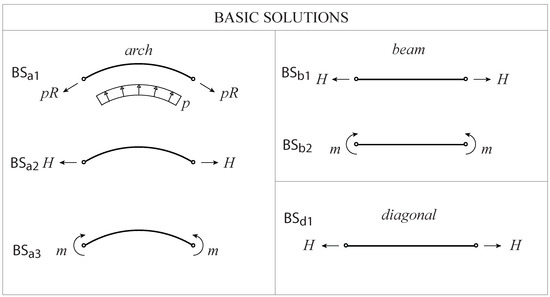 The equilibrium equations are solved as a superposition of some basic solutions () (see Figure 6) of statically determined problems.
