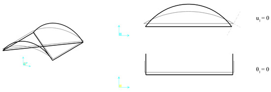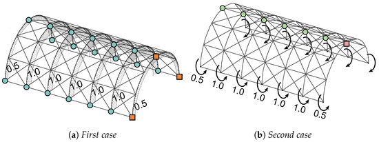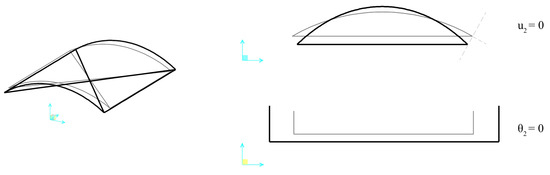 Boundary conditions () are assigned with reference to the displacement components defined in Section 2.4. In both cases of Figure 12a,b all the nodes of the gridshell depicted as a circle have . However, in order to avoid the rigid translation in y direction, the arch where nodes are depicted with squares have .