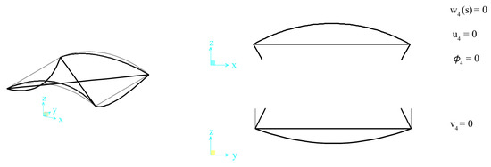 In this case on the arch both and are applied, while only is applied on the beam, then the basic equilibrium solutions to be used for the arch are and , by posing , and , respectively, while must be used for the beam, by posing and for the diagonal, by posing . Then, by integrating the compatibility equations for arch, beam and diagonal, we obtain the following results for the displacement fields (see Figure 9 for deformed configuration):
