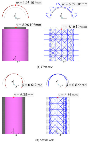 In the first case (a), the coarse model behavior can be characterized just by and . These strain measures are constant all along whole shell; in particular, and . By applying Equation (7), the w component of the displacement vector is calculated equal to m. Thus, the percent error between the coarse model and the fine model is below 1%.