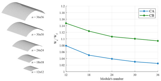 Figure 14 depicts the ratio (/) of the mechanical work of the continuum model () over the mechanical work of the fine model (). As could be expected, when the number of modules increases the response of both continua tend to that of the corresponding fine model. Although the trends are similar, the response of CA is closer to that of the fine model than CB’s one. Since both curves take values greater than 1, the equivalent continua reveal to be more flexible than the corresponding gridshells.