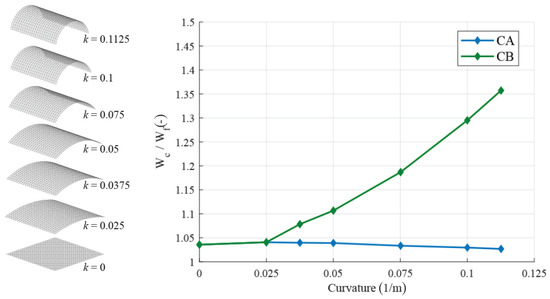A second comparison is performed in order to study the effect of the geometric curvature . Seven numerical tests are performed on purpose, where the gridshells are subject to the same loads and b.c. as in the previous test. This time the number of modules is fixed to (n = 24), while the curvature ranges from 0 to 0.1125 m (Figure 15).