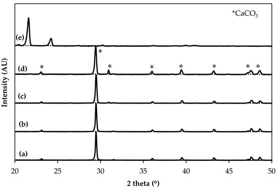 X-ray diffraction (XRD) patterns of (a) eggshells, (b) eggshells treated with stearic acid, (c) limestone, (d) limestone treated with stearic acid, and (e) stearic acid particulates.