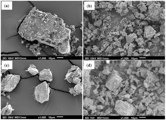 SEM micrographs showing particle morphologies of (a) eggshell, (b) eggshell/stearic acid treated, (c) limestone, and (d) limestone/stearic acid treated.