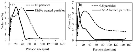 Particle size volume distribution curves for (a) eggshell (ES) and eggshell/stearic acid treated (ES/SA) and (b) limestone (LS) and limestone/stearic acid treated (LS/SA).
